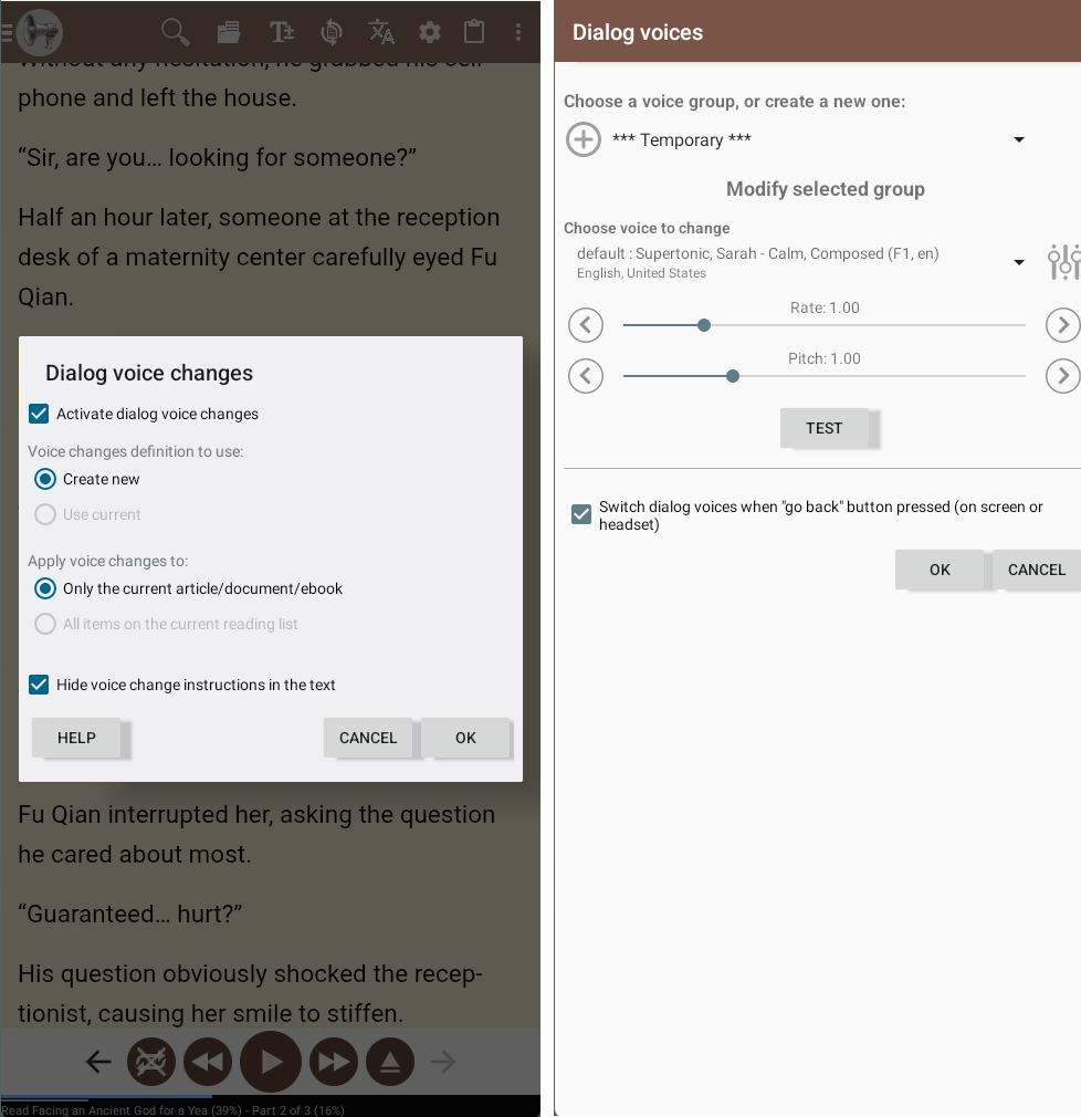 A plain TTS voice can work well for information, but fiction listeners often want more character separation. @Voice includes advanced dialog-voice tools that can make novels easier to follow.
