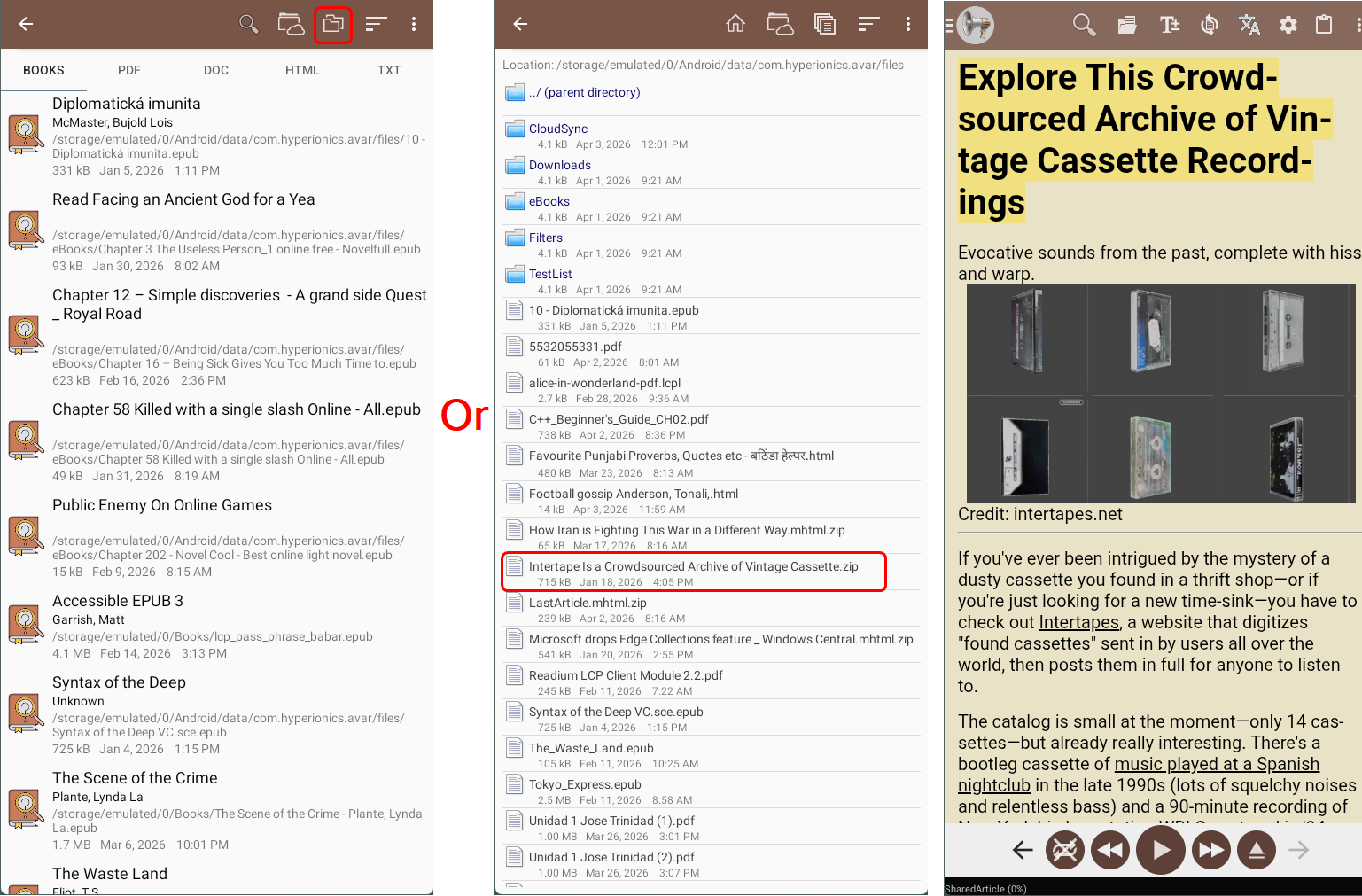 @Voice gives you one reading environment for supported files and shared content, with consistent playback controls, bookmarking, recent history, and install options for standard or de-Googled Android setups.