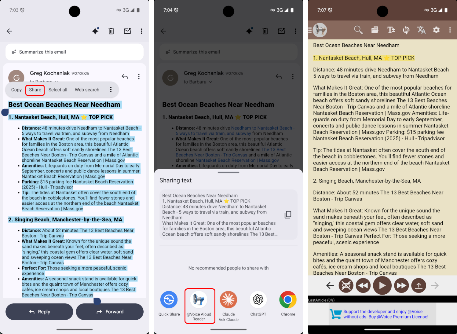 A lot of practical read-aloud use on Android is not about formal files at all. It is about email, message drafts, copied passages, app screens, or text that another app can share.